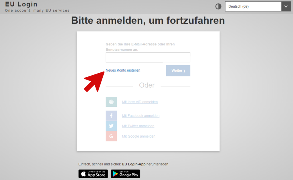1. Öffnen Sie die Webseite für den EU-Login: https://webgate.ec.europa.eu/cas